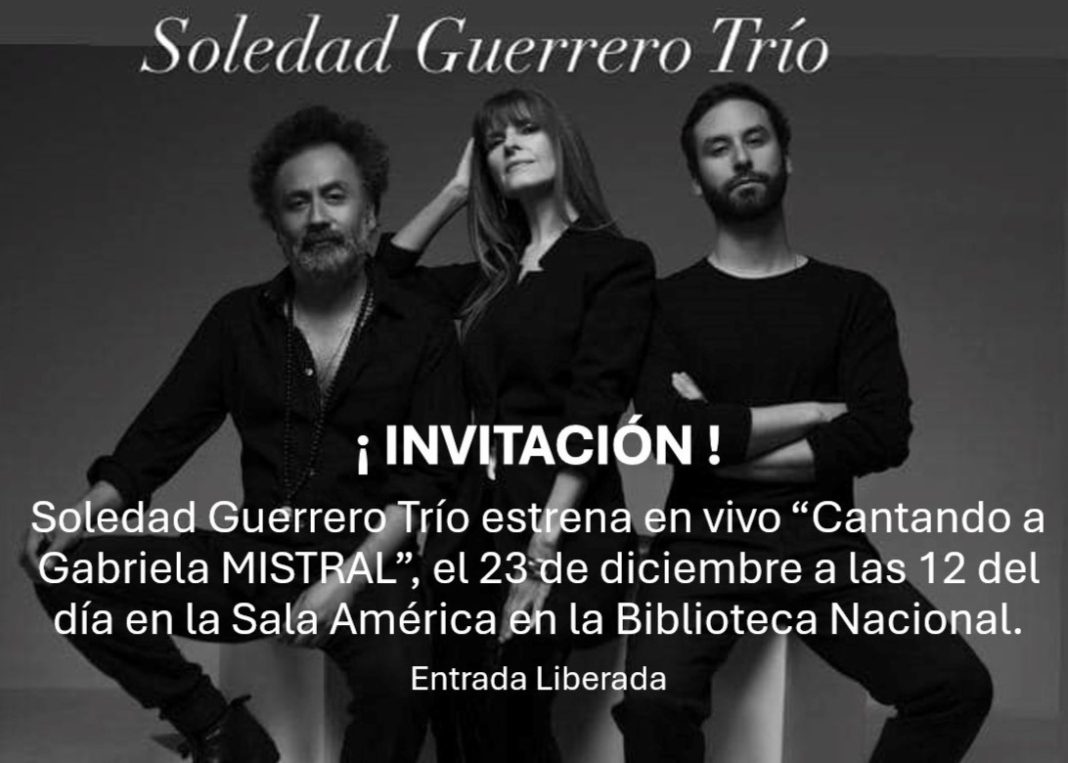 El Soledad Guerrero Trío presentará “Cantando a Gabriela Mistral” el 23 de diciembre en la Sala América de la Biblioteca Nacional. En la instancia el público podrá escuchar por primera vez la obra completa interpretada en directo. Entrada Liberada.